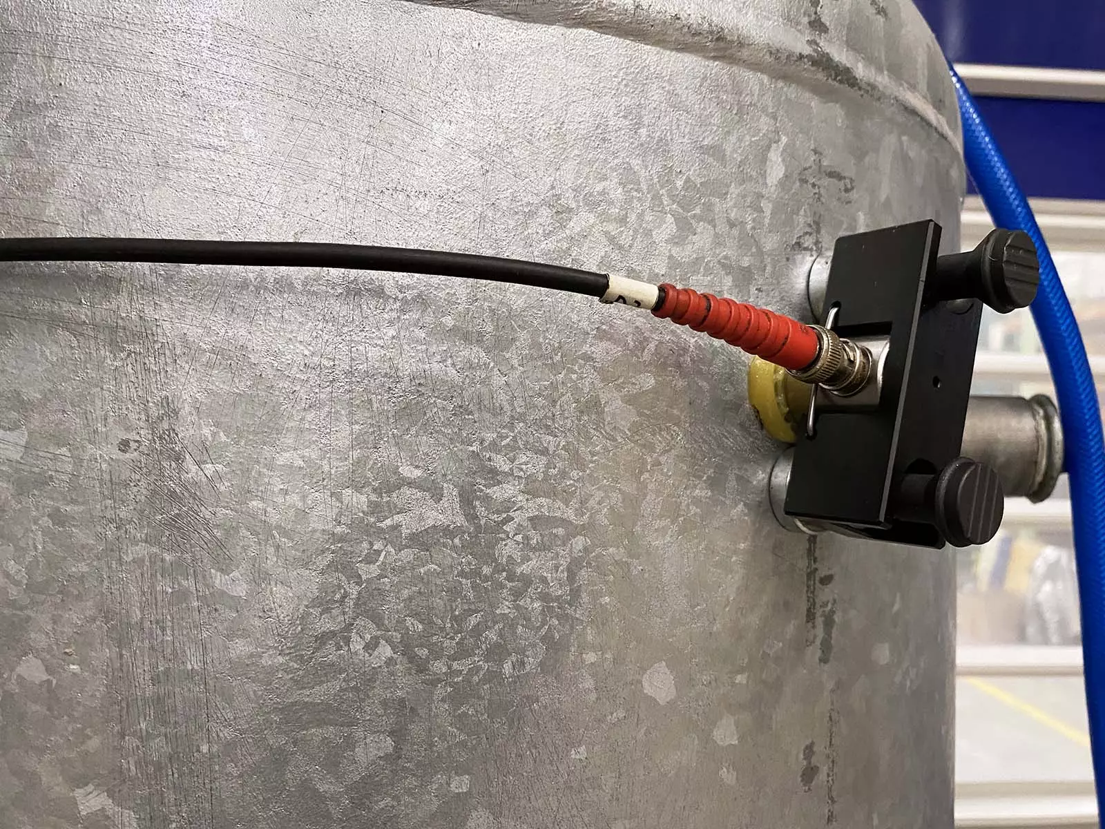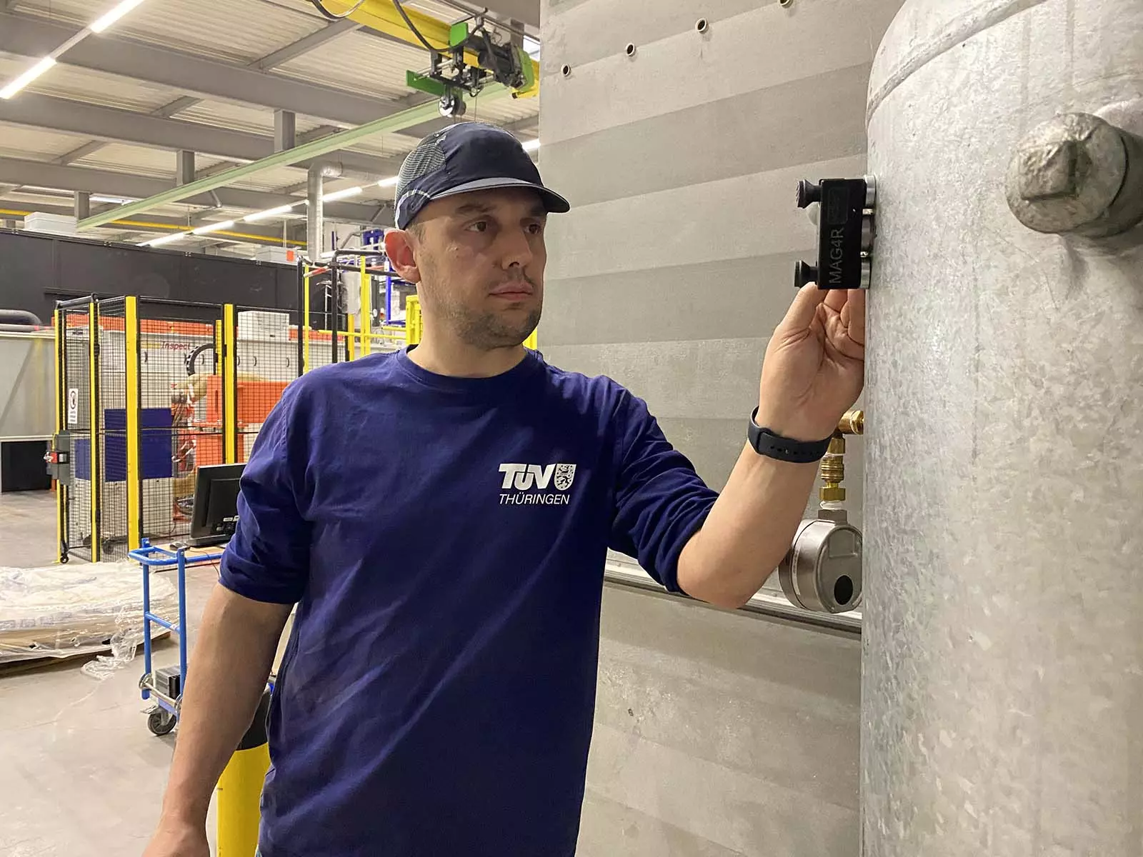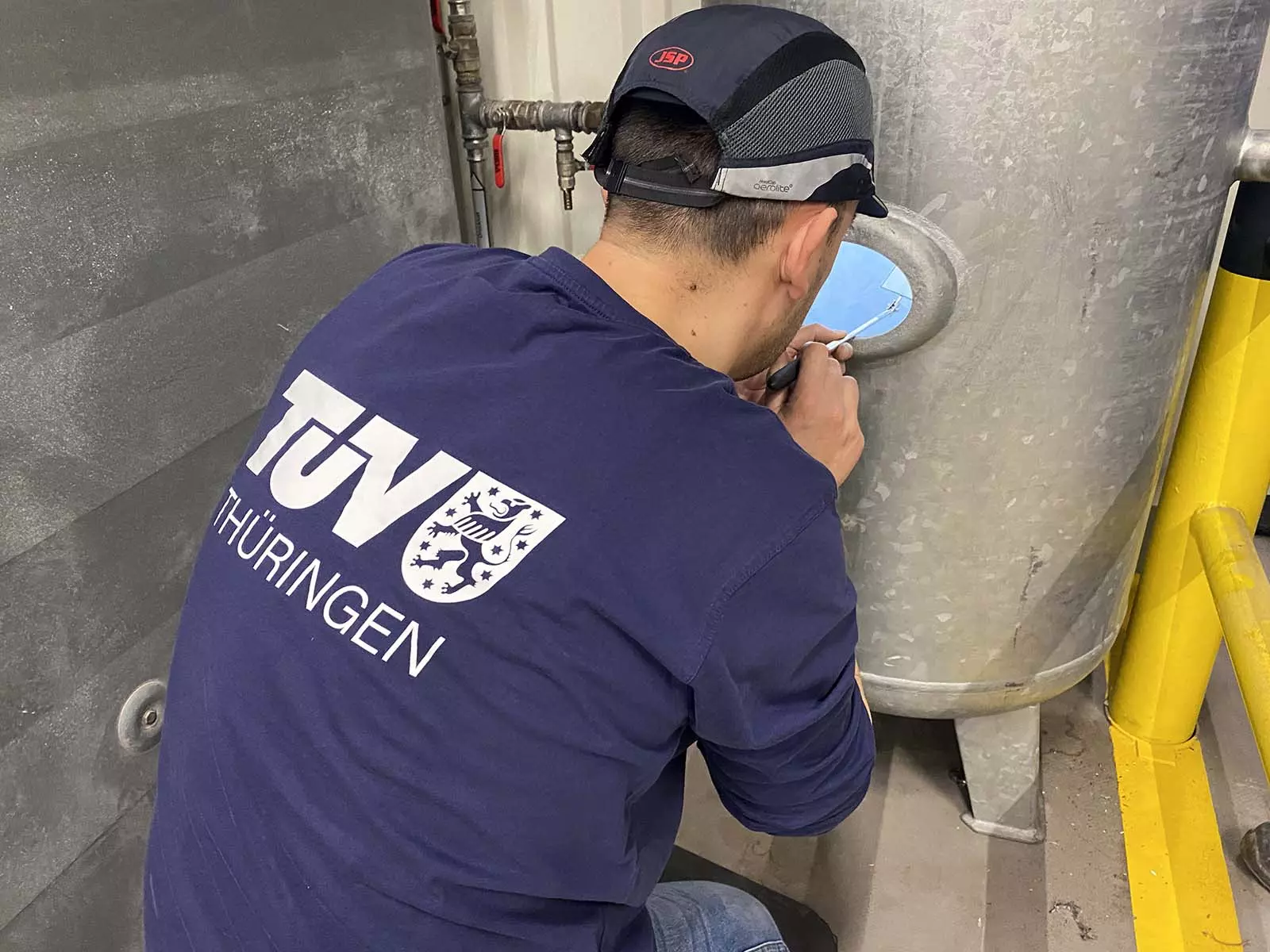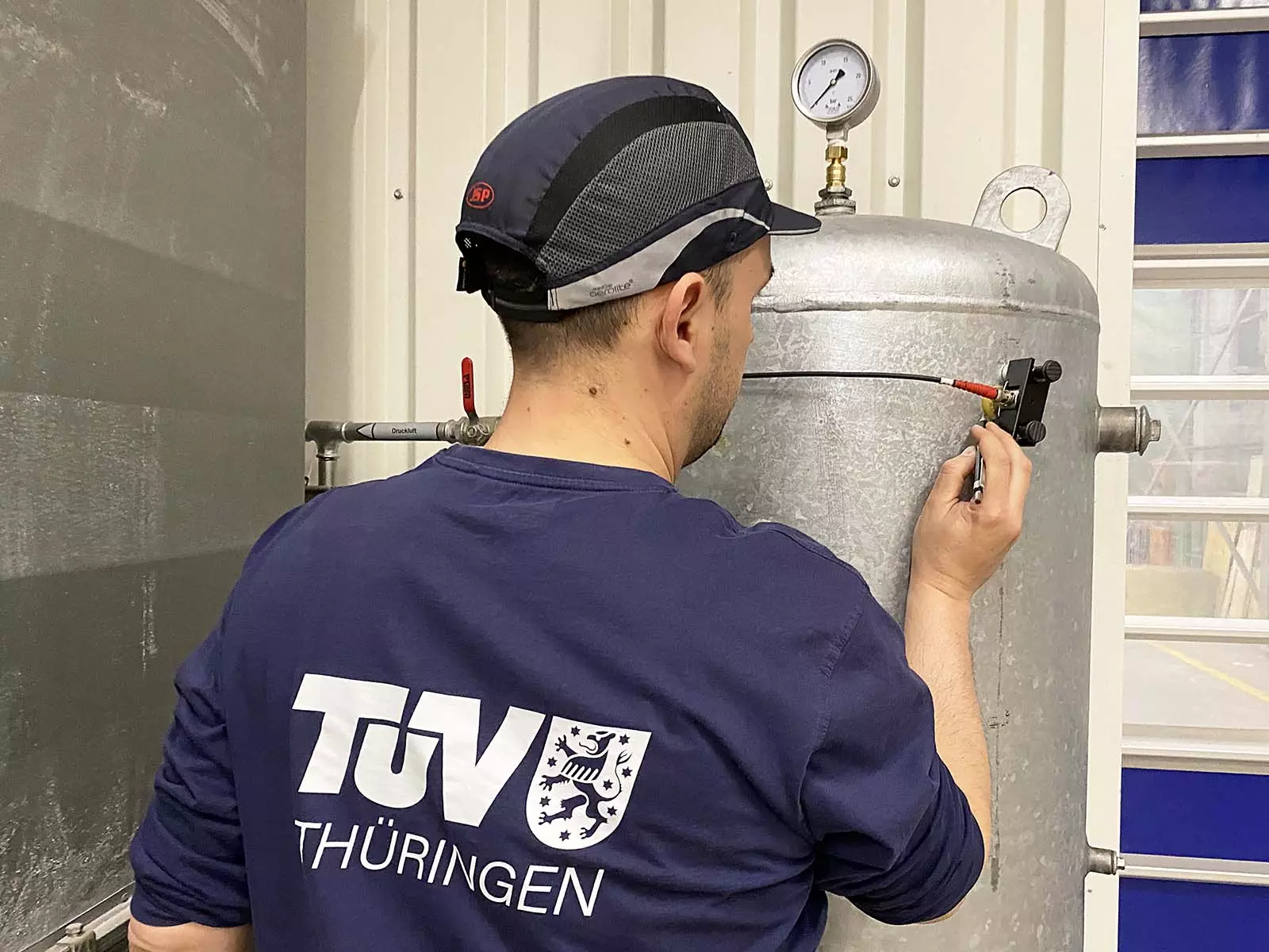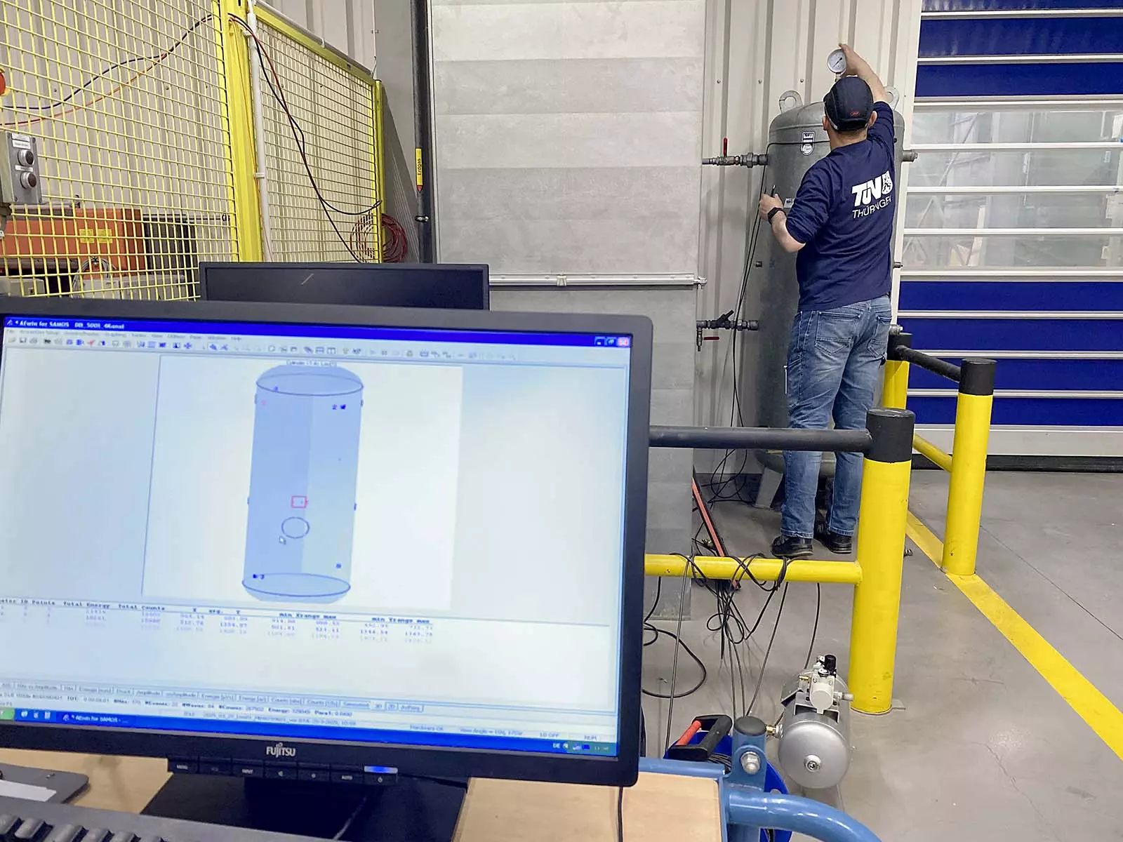 Druckluft ist einfach zu erzeugen und kann sehr gut in sogenannten Druckluftspeichern bevorratet werden. Das sind spezielle Druckbehälter, die über Leitungen in den Produktionsprozess eingebunden sind. Wie alle Druckbehälter müssen auch Druckluftspeicher regelmäßig auf innere Unversehrtheit und Festigkeit geprüft werden, denn das Material der Behälter kann genau wie die Schweißnähte über die Jahre ermüden. Im schlimmsten Fall kann die Alterung zum Bersten der drucktragenden Wandung führen. Für die Prüfung von Druckluftspeichern setzt der TÜV Thüringen seit Jahren sein digitales und nachhaltiges Ersatzprüfverfahren SEP ein. Mit Hilfe der Schallemissionsprüfung (SEP) können die Sachverständigen digital kleinste Auffälligkeiten im Material aufspüren und visualisieren.