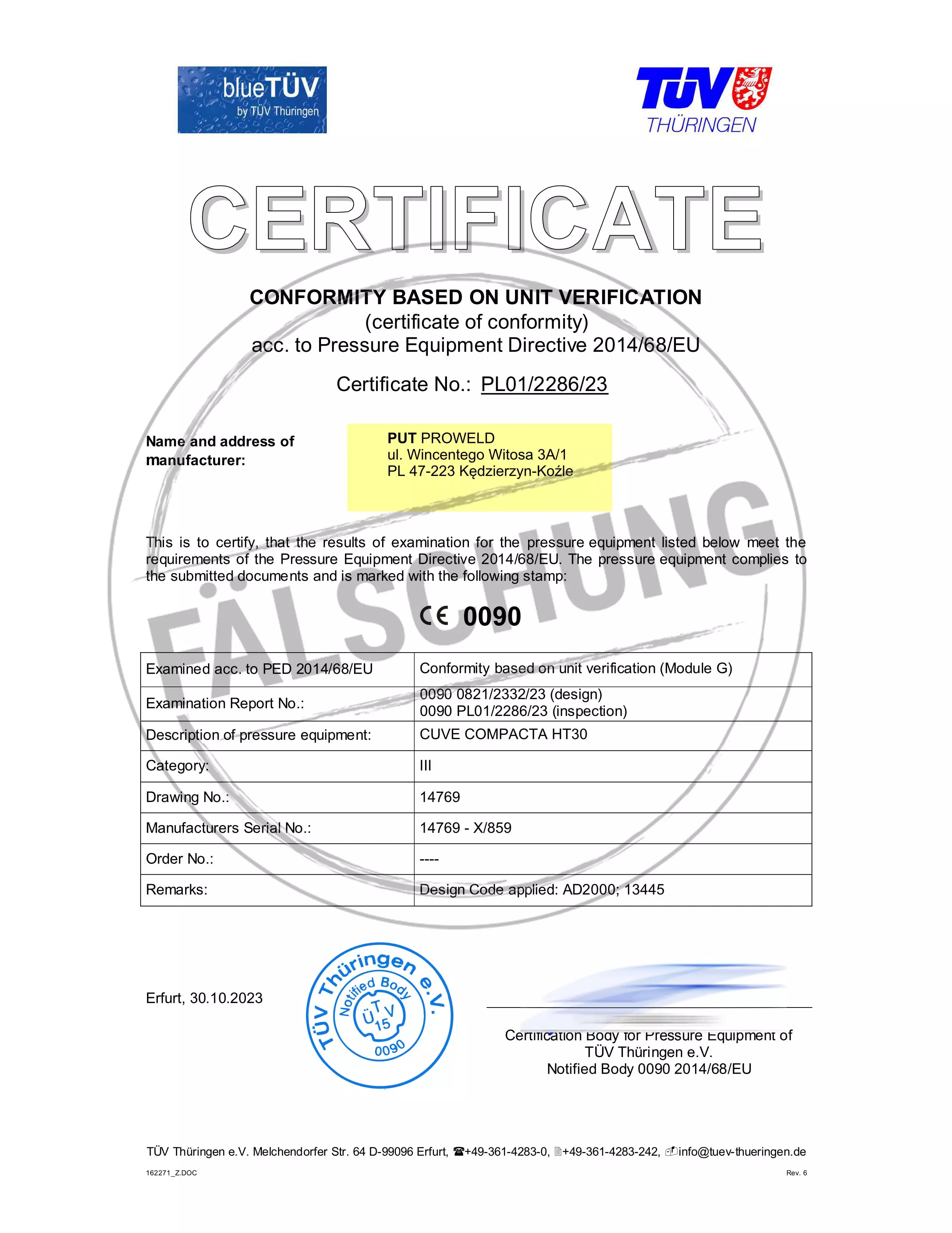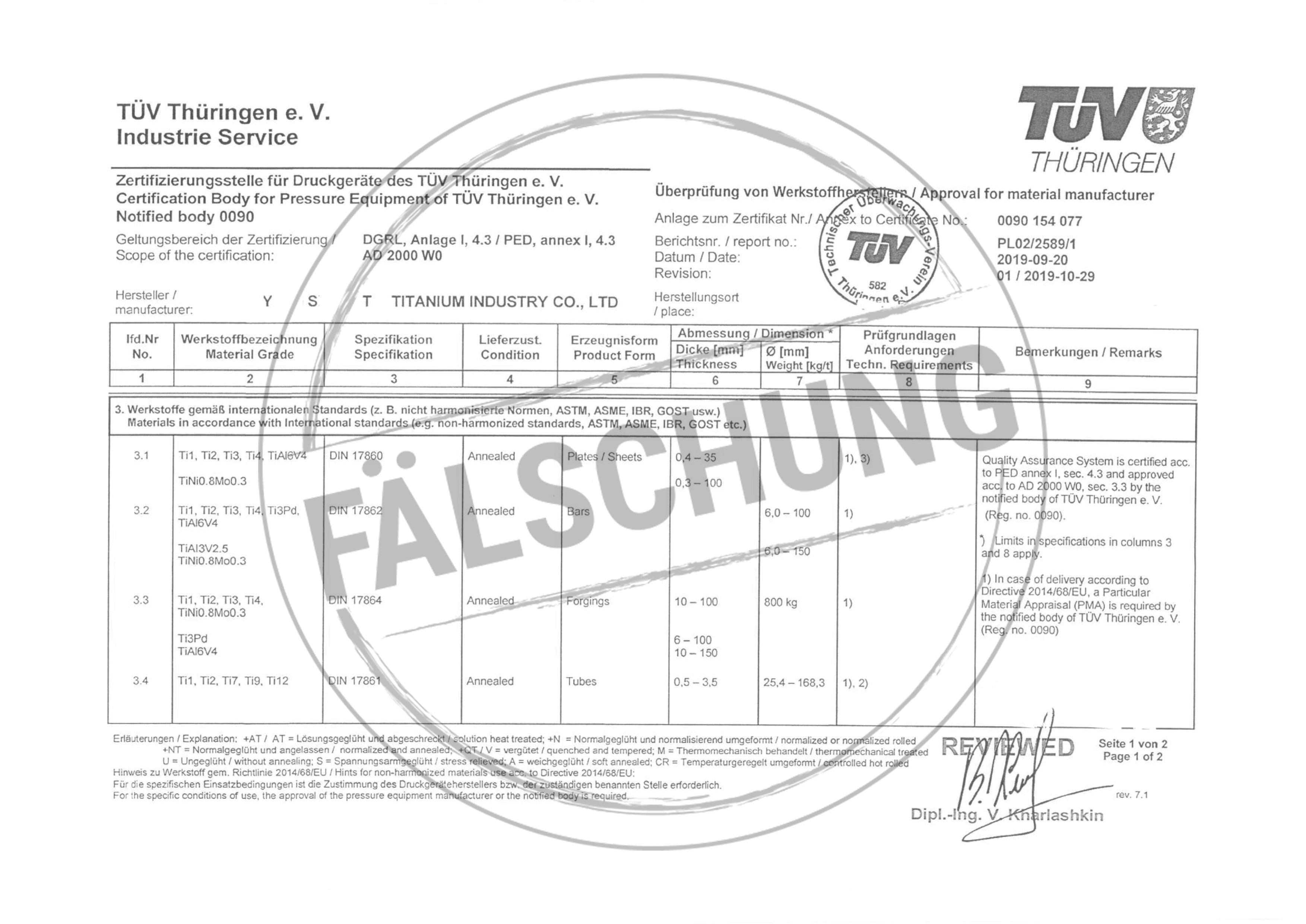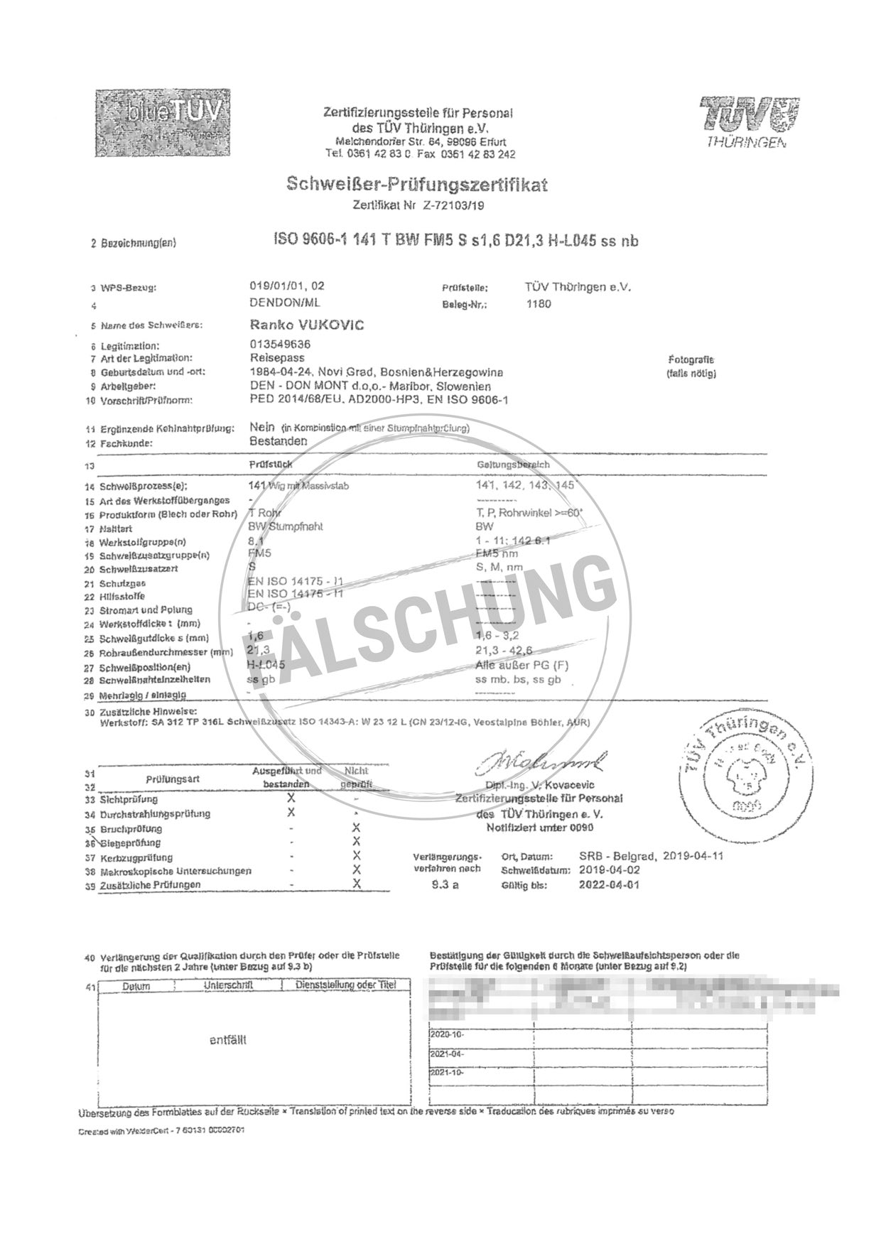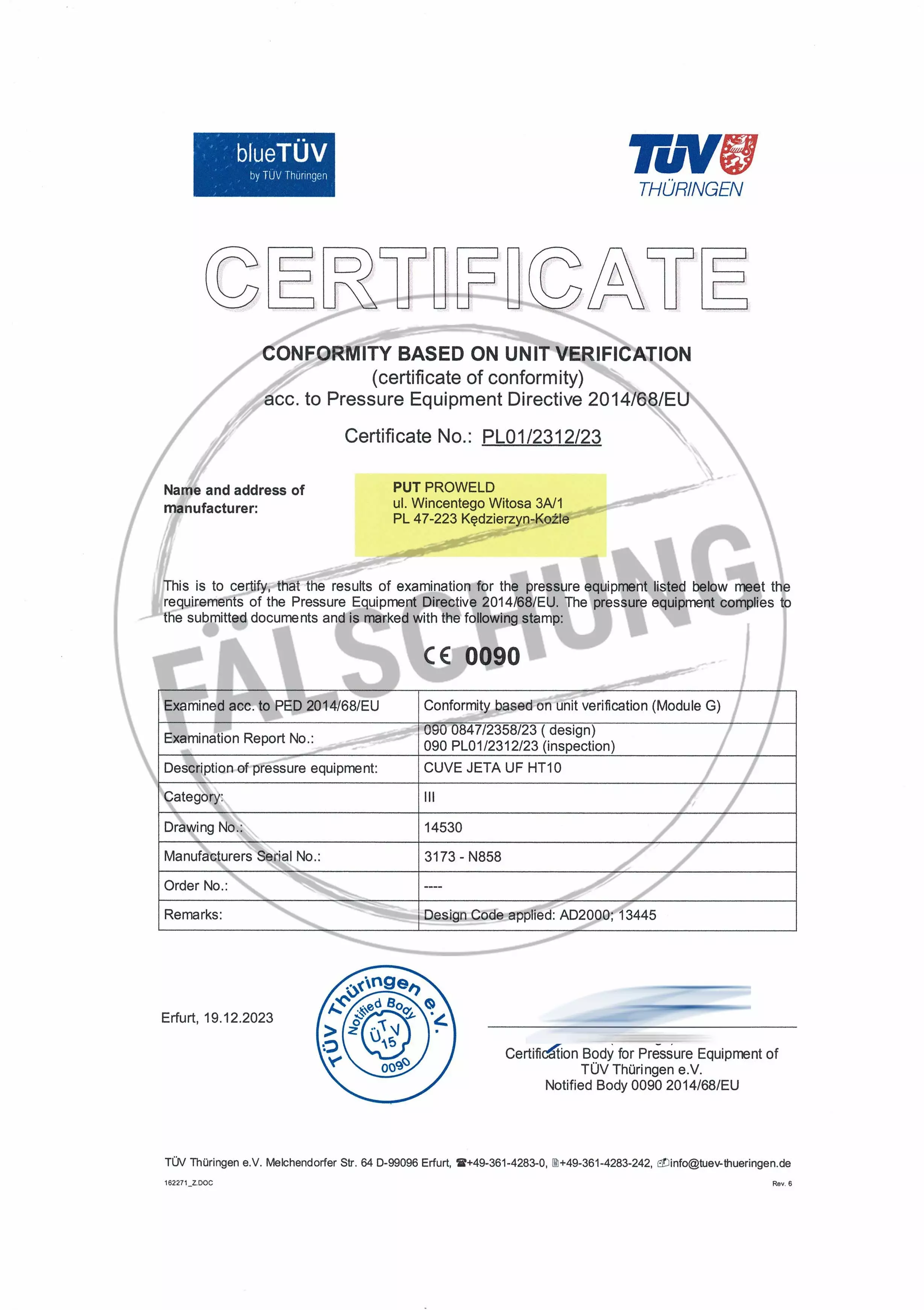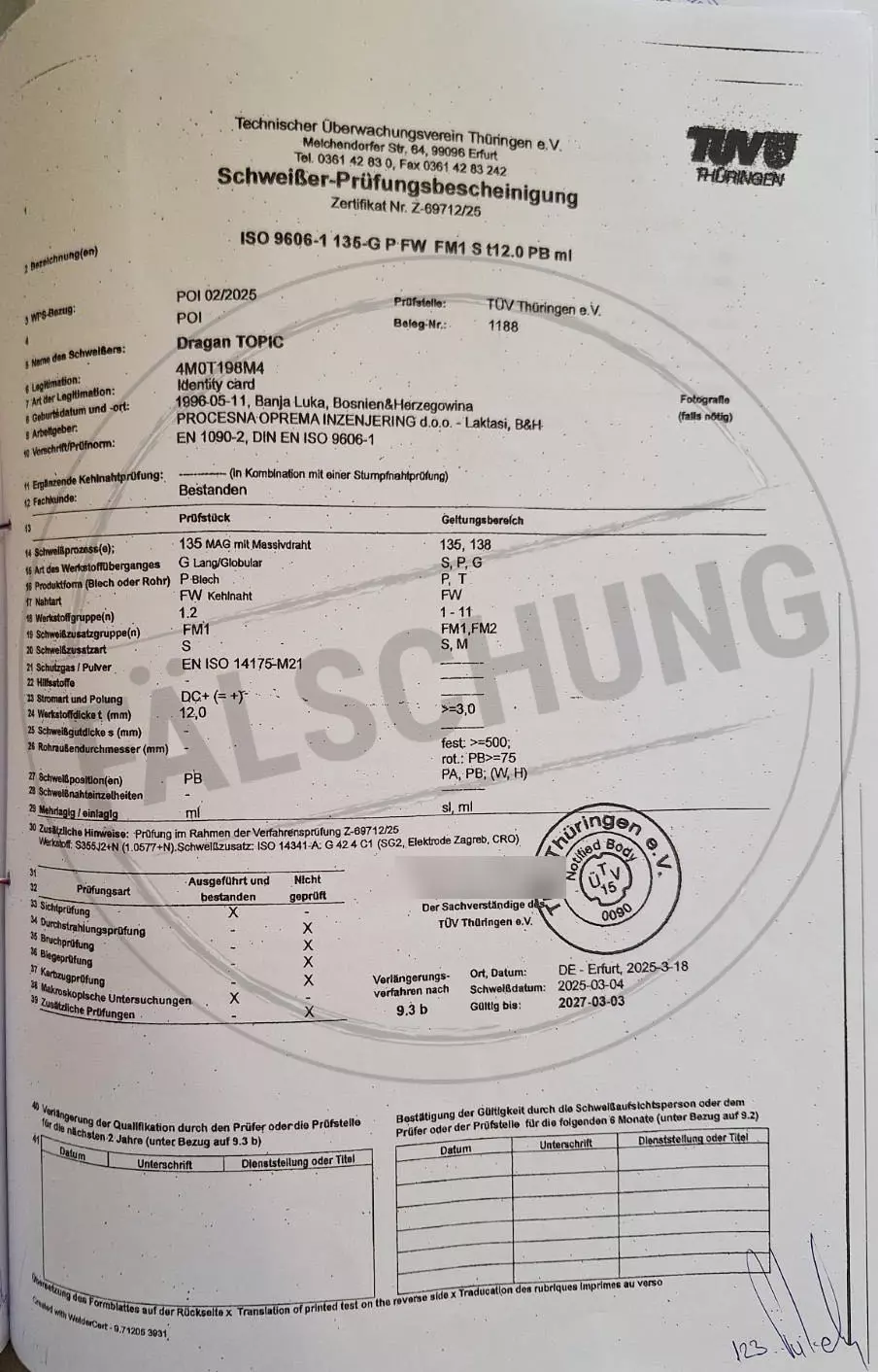 Следующие подделанные знаки контроля и сертификаты TÜV Thüringen, которые ни коим образом нами лично не распространялись, известны нам: