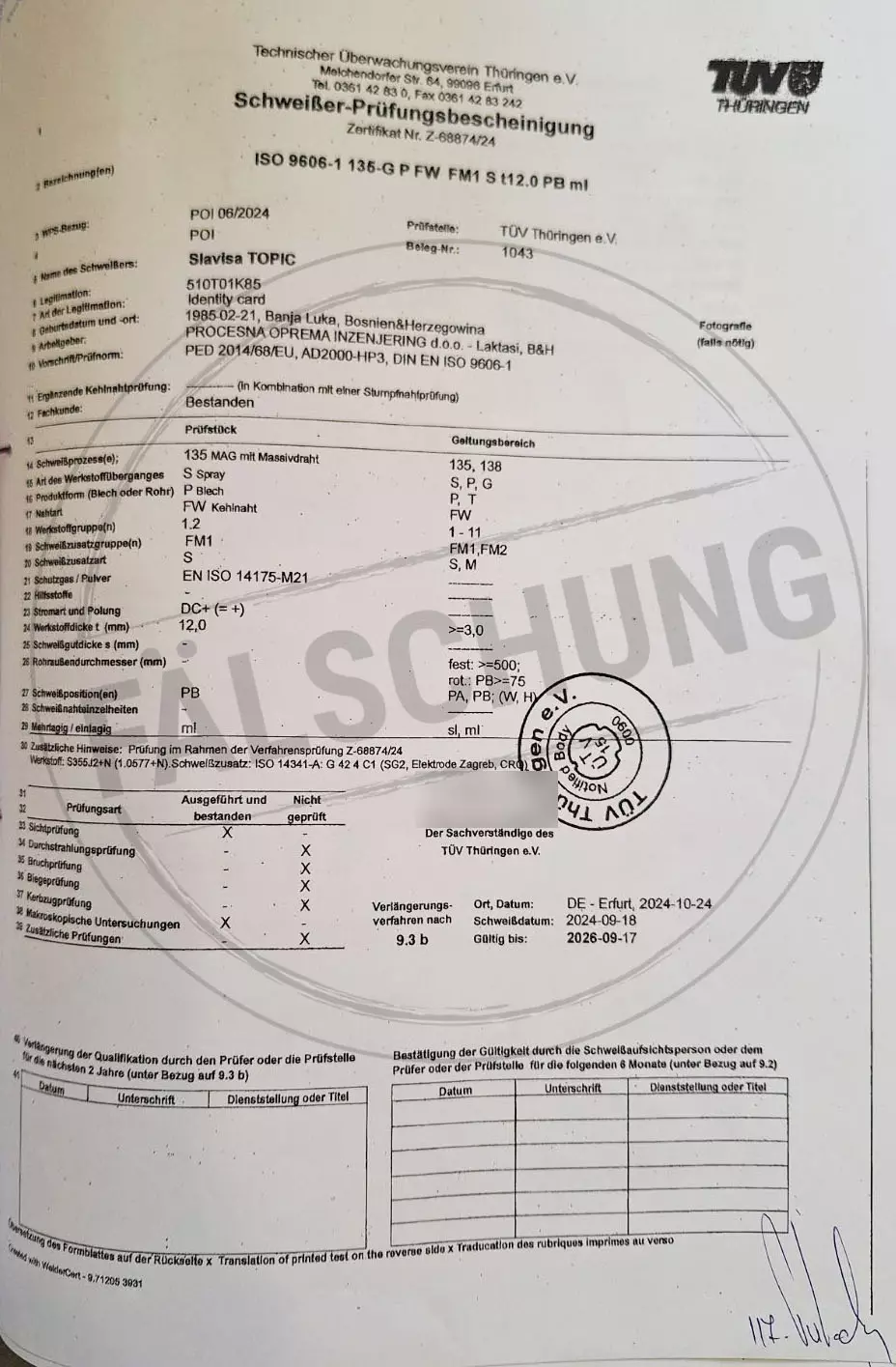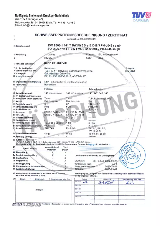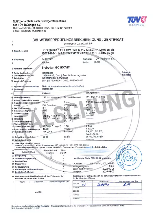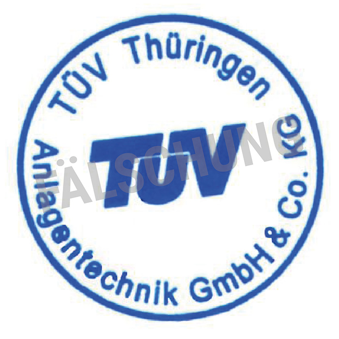 Folgende gefälschte Prüfzeichen und Zertifikate des TÜV Thüringen sind uns bekannt geworden, jedoch von uns selbst in keiner Weise veranlasst: